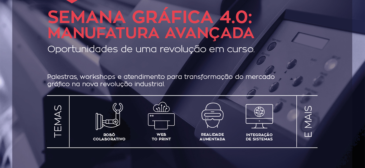 A Faculdade SENAI de Tecnologia Gráfica realizará durante cinco dias no mês de junho a Semana Gráfica 4.0 – Manufatura Avançada, com a finalidade de promover discussão relacionada à Industria 4.0 e seu impacto na Indústria Gráfica e atividades afins.