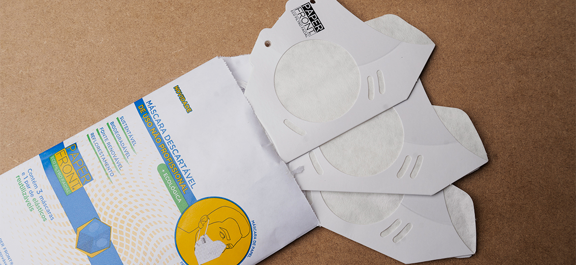 A nova máscara PAPER FRONT® Eco Filtro Facial foi desenvolvida em estrutura de papelcartão TP White® Plus da Suzano e revestida internamente com papel-filtro tratado, para maior resistência à umidade. A máscara é uma alternativa que une design e praticidade e é produzida em larga escala, a partir de papéis provenientes de fontes renováveis certificadas.