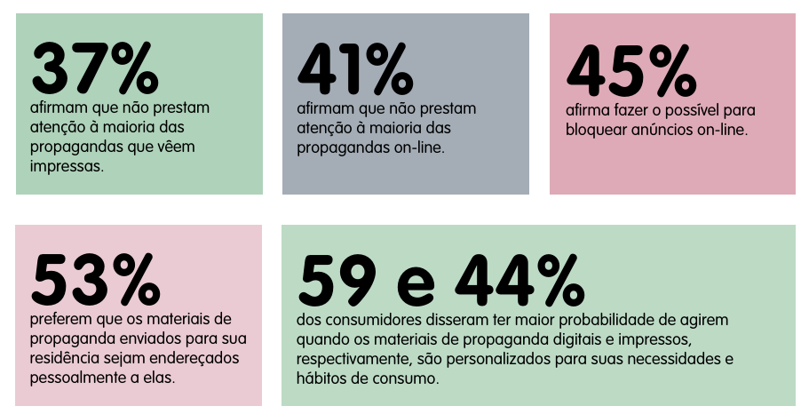 A publicidade online também foi avaliada na pesquisa Trend Tracker 2025: 41% dos consumidores afirmam não prestar atenção na maioria dos anúncios online e apontam como causa a fadiga digital e a maior eficácia do marketing impresso.