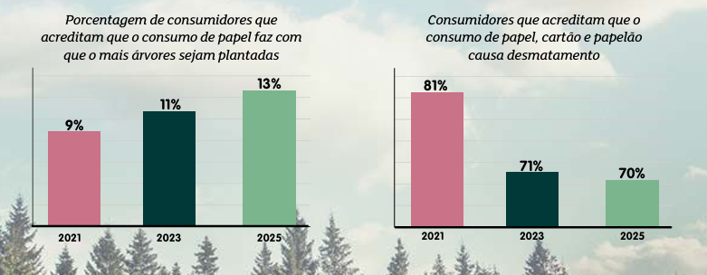 Entre os indicadores levantados na pesquisa, está o fato de que 6 em cada 10 consumidores (59%) consideram o papel/papelão melhor para o meio ambiente, mesmo percentual daqueles que preferem esse tipo de material nas embalagens por considerá-los mais sustentáveis, enquanto 80% dos entrevistados afirmam ser importante utilizar produtos de papel originados de florestas manejadas de forma sustentável.