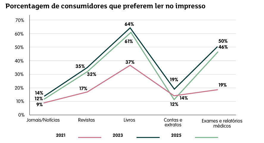 A pesquisa bienal de Two Sides mostra que 61% dos consumidores preferem ler livros em formato impresso. Uma parcela importante dos entrevistados (65%) acredita que as crianças aprendem melhor com materiais impressos do que digitais. Já 8 em cada 10 entrevistados (84%) defendem o direito de escolher como receber contas e extratos (se impressos ou em formato digital).