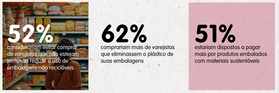 Embalagens de papel também são as preferidas pelos compradores online (65%) e, para a parcela dos que fazem compras em lojas físicas, 52% consideram reduzir compras de varejistas que não estejam utilizando embalagens sustentáveis, e outros 62% comprariam mais de lojistas que eliminassem o plástico de suas embalagens.